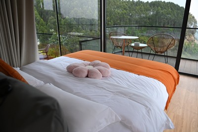 沿烧烤区爬坡而上约1.5公里处,便到了悬崖太空舱住宿观景区,四个太空舱“旅店”,倚靠在约400米高的崖壁处,住进这个悬崖“旅店”遥望远方豁然开朗,可看日出可观日落,漂亮得很!
