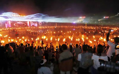 晚上8时半,火把广场独具彝族特色的歌舞演出拉开帷幕,从古老的彝族传说舞蹈,各民族和谐共处的大合唱,洋溢着青春活力的现代音乐表演:灯光秀"光影夜宴″更是將现场氛围推向高潮,通过灯光的明暗交替,色彩变幻与角度的切换,营造出奇幻多变的场景,为万余名游客带来闪亮的视觉享受。晚10点,海坪箐火晚会开始,火把广场内火盆瞬间彼点燃,熊熊列焰直冲夜空,点燃了夜幕,点燃了广场周围山头上万支火把,点燃了在广场上万游客的狂欢激情。欢快的彝族音乐响起,身着漂亮民族服饰的彝家儿女笑容滿面,