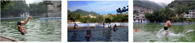 图(1)→年过花甲的冬泳爱好者张中平随时腾空翻身跳入水中的场面;图(2)→游泳池分上下两个,下边池子水深1.5米,上边池子右边约五分之四面积水深约2米,左边五分之四面积水深约0.5米,适合小朋友戏耍;图(3)→2015年8月1日上午,有位游泳爱好者竟然在下边游泳池玩起水上自行车项目。