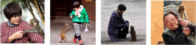 图(1)→波波随时吊在金龙公园老板娘刘凡玉身上撒娇要吃;图(2)→小姑娘衣服篼里的糖果不给走不了路;图(3)→只要有东西吃就守着你;图(4)→我进公园波波会从树上遛下来,习惯地爬到我肩上,要我老在肩上走进更衣室,待我换好游泳裤跳入水中,波波才围着游泳池边跟着我追。
