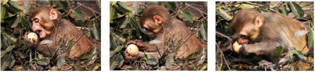图(1)→2010年12月20日,中午2点钟,波波在草丛中遛达的场面;图(2)→看到一个白色的、椭园的、光滑的东西,觉得稀奇古怪,毫不犹豫地拣起来玩。吔!还沉甸甸地。波波将这东西拿起来,翻来覆去地左看右看,上看下看,前看后看……哦!这不是人们说的鸡蛋吗?图(3)→这鸡蛋能吃吗?从哪里下口呢?管它三七二十一,咬一口来尝尝再说。波波像咬蟠桃那样习惯性地轻轻一咬,吔!还比较硬呢。