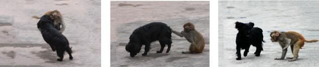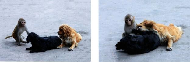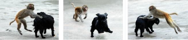 山中无老虎猴子充大王,金龙公园老板喂的小黑、小黄两只小狗在波波的长期训练下,服服帖帖,俯首称臣,齐天大圣的美誉还真是名不虚传。