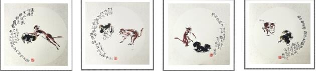 图(1)→诗配画的文字内容“这是啥情况,人都说冲动是魔鬼”;图(2)→诗配画的文字内容“打个招呼试水深,城里套路深,我要回农村”;图(3)→诗配画的文字内容“终于安静了”;图(4)→诗配画的文字内容“山中无老虎猴子充大王”。
