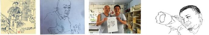 图(1)→2021年7月26日2022年2月12日,张强给我画的《时代的记录者》的工笔画;图(2)→2022年4月29日,我俩坐在一起参加一个学术交流会,他用餐巾纸就勾了这幅肖像;图(3)→2021年7月26日,在他工作室10来分钟就画了这幅肖像;图 (4)→2006年4月12日,在珙县第一高级中学多功能大厅他给我画的工作照。