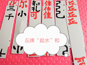 “上大人”又称长牌,俗称纸叶子,据说是一种来源于“孔夫子”故事的民间纸牌。纸牌长约10厘米,宽约1点8厘米,每张牌正面写上一个牌文字,牌文在每张牌两端书写,将每个句子的第一个字(上、丘、化、七、尔、八、佳、可共八个字)制成红色,其余十六个字制成黑色。“上大人”集启智、娱乐为一体,熔书法、识字于一炉。九十六张纸牌虽小,但张张蕴藏玄机,尤其是古朴苍劲的书法令人赏心悦目,一笔一画都体现出了中国传统文化的博大与精深。