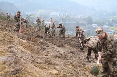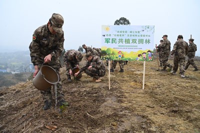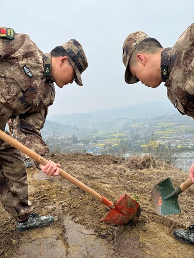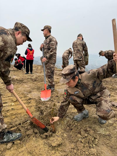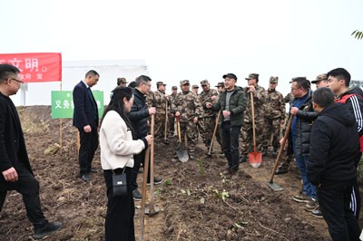 栽下希望苗,发出梦想芽,结出“双拥果”。在第47个植树节即将到来之际的3月10日一早,身着迷彩服的25名“戎耀家园·暖心邻里”自贡“江姐老兵”志愿服务队荣县分队队员,扛起锄头、拿起铁锹、提着水桶、捧起树苗,在旭阳镇程家桥村刚刚整理出来的这片荒地上,与县人武部、旭阳镇、县退役军人事务局等种下荣县第一片“双拥林”。