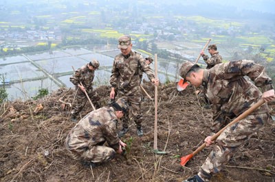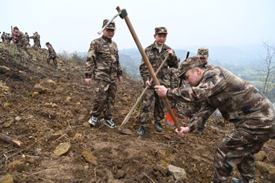 队员张军,他放弃手工秘制功夫新茶创收的“黄金期”,一大早就从40公里外的双古镇驾车赶往植树地,又是挖土打窝又是栽苗浇水,他和队员朱攀水合力种下12株油茶树苗,然后小心翼翼地培上细土,还在树苗边“盖”上两人的脚印。“明年、后年植树节,我们再来这里浇灌,一定要让你们(12株油茶树)硕果累累。”两名营级军官转业的队员栽下树苗后这样说。