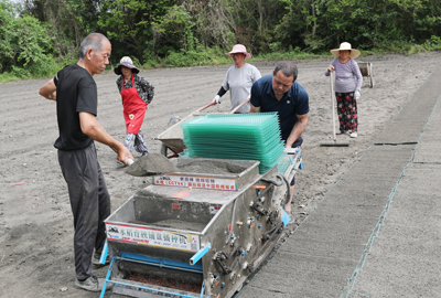 旱地精量直播试验田中,数位村民正拉着一台水稻铺盘育秧播种机进行旱育苗播种。长河村党委书记徐发明向区融媒体中心记者介绍,“为了贯彻落实习近平总书记把粮食安全牢牢掌握在自己手中的指示精神,根据区,街道领导工作安排,今年集中收归劣质苗木腾退田块,由村集体种植川农大水稻研究所的推广香稻品种‘川郁香’1号,计划种植200亩有机稻。在老科协的帮助下,前年和去年已通过权威部门有机稻转换认证验收,各项指标合格,如果今年有机稻转换验收再次合格,那么就会取得有机稻销售合格证待,也创新了团结街道有机稻生产历史,为成都市市民在餐桌上吃到便宜的,安全的,香喷喷的有机大米提供了又一选择。”
