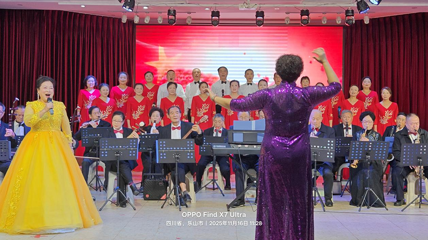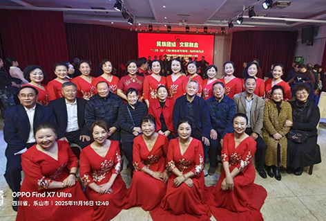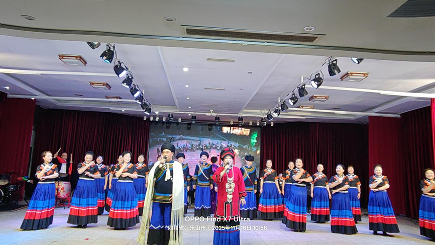 2025年11月16日,乐山市市中区新跃山庄内灯火璀璨、欢声如潮,“三县一区”共庆2025彝历新年暨第三届联谊文艺展演隆重举行。来自马边彝族自治县、峨边彝族自治县、沐川县与金口河区的数百名退休文艺爱好者齐聚一堂,以歌为媒、以舞传情,共同演绎了一场兼具民族特色与时代气息的文化盛宴,庆祝彝族人民最隆重的传统节日。其中,金口河区老科协大瓦山之声艺术团自6月正式成立以来,以“老有所为、老有所乐”为核心,将精心策划、编排并首次参加四地联谊展演带来的合唱《山丹丹开花红艳艳》《留客歌》、独唱《江山》及情景剧《卡莎莎》红歌联唱《毛主席的话儿记心间》等精品节目惊艳全场,以艺术之力串联红色记忆、民族情谊与奋斗历程,成为整场汇演的夺目亮点。