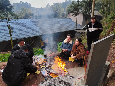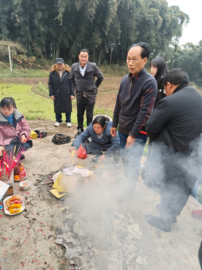2025年1月30日,即正月初二,沐川县沐溪镇李正银携爱人吴翠莲等亲朋家人到杨柳村五组为2024年去世的岳母王修荣、伯岳父吴万堂烧新香。