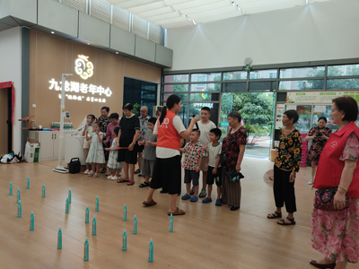 套圈游戏环节将活动氛围推向高潮,深受大家喜爱。工作人员为每位参与者发放一个大圈,孩子们兴奋不已,手持圆圈跃跃欲试;老人们则在一旁加油助威,脸上满是慈爱。随后,老人们也积极加入游戏,认真遵循规则套圈。每当有人成功套中物品,现场便爆发出一阵欢呼,无论是套中的孩子,还是一旁的老人,都笑得合不拢嘴。未套中的伙伴也积极寻求帮助,其中一位小朋友在工作人员引导下,请小伙伴帮忙成功套中,两人脸上洋溢着喜悦。这个游戏不仅让孩子们体验到成功的快乐,更让老人们感受到与孙辈共度的欢乐时光,欢声笑语中,幸福与温馨满溢。
