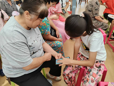 随后,活动进入了手机教学环节。小朋友们耐心地教爷爷奶奶们如何操作智能手机,从最基本的开关机、拨打接听电话,到更复杂的微信聊天、视频通话、微信付款、导航等功能,一一进行了详细的演示和讲解。长辈们则虚心地学习,认真地记录下每一个步骤,不时提出自己的疑问。小朋友们也耐心地一一解答,当遇到自己也不会的问题时,他们会请教我们耐心的“天府银龄”志愿者。志愿者们也会主动上前,适时地提供指导和建议,使得现场气氛既温馨又活跃。长辈们在得到小朋友们的帮助后,还开心地说谢谢,有的小朋友甚至带着长辈进入他们的手机游戏世界,祖孙两人一起玩得非常开心。通过这次活动,不仅让老年人深刻感受到了科技的魅力,还增强了他们的社会参与感和幸福感。同时,活动也极大地增进了祖孙之间的默契与情感,使得祖孙关系更加和谐。