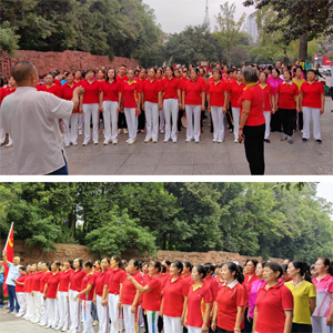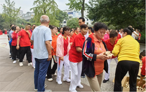 9月29日上午8时,100多名队员欢聚在双流棠湖公园艺术墙广场,首先跳起了欢乐的圈圈舞。欢快的舞步,愉悦的氛围,呈现出浓浓的节日气氛。