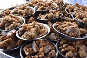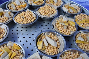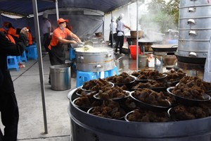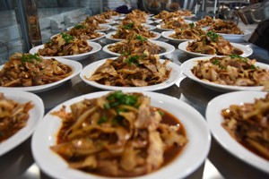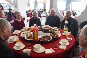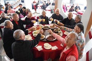 11点35分,老人们看完演出,便移步就餐。此时,厨房近10名工作人员已经将香喷喷的16个菜端上了桌子。“来,为我们老人的节日,干一杯!”宴席开始后,一名老人以饮料当酒,向老人们这样吆喝着,随即:“干杯!”的话音伴随笑声在就餐地响起。