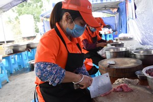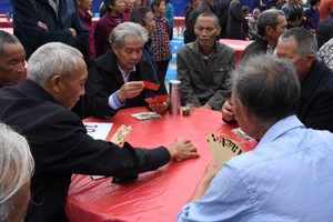 现场看到,村委办公室外的广场里,摆满了就餐桌椅,村委正门口,身着红裙的一群老人们正在翩翩起舞,落座的老人们则津津有味地欣赏着这一个接一个的舞蹈,喜欢扑克长牌的老人,则玩起了自己的爱好,活动旁边被帐篷围起来的“厨房”里,早已飘出了坨子肉、夹沙肉、烹鱼的诱人香味。