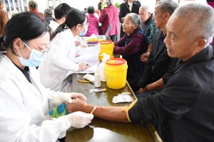 除了吃大餐、看大戏,还有高山镇卫生院义务为老人体检的医护人员。老人们挽起袖子,让医护人员抽血做肝功、血糖等体检,排队体检现场秩序井然。