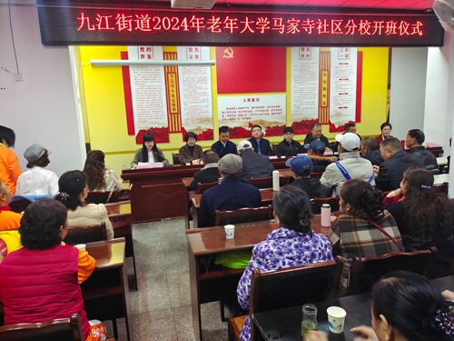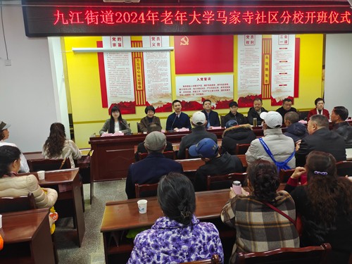 开班仪式由九江街道老年大学马家寺社区分校校长李国芳主持。首先由马家寺社区党委书记谭琪讲话。他代表马家寺社区两委对九江街道老年大学马家寺分校开设的柔力球、音乐、舞蹈、太极拳、乐器、腰鼓班等表示祝贺。他希望社区老年学员们多学习,多交流,真正做到老有所学,老有所乐,老有所为。马家寺社区两委为老年大学开展各种活动提供专项资金保障。希望社区新入户的,常住的所有老年人都投身到老年大学开设的各种所喜欢的班中学习锻炼。
