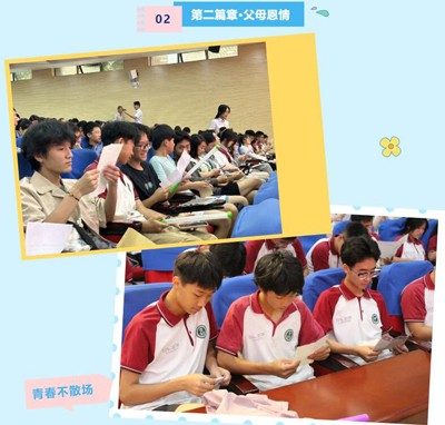 晨光熹微,她为你备好热气腾腾的早餐;月挂树梢,他翘首期盼你的归家平安。家,无论多晚,总有为你而留的一盏灯。毕业典礼上,家长们也共同见证着这一重要时刻,以笔墨笺染的传统书信给孩子们写了一封情书。灯光下,孩子们嘻嘻笑笑带着好奇拆开了书信。可读着读着,他们沉静下来,有的低头不语,有的闭眼回忆,还有的轻声啜泣。一字一句,此时无声胜有声,书信里的纯粹爱意打开了他们心扉的房门。