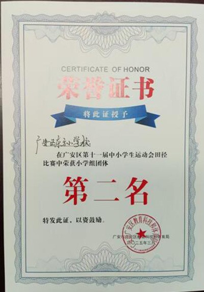 热烈祝贺广安区东方小学校在广安区第十一届学生运动会田径比赛中荣获小学组团体总分并列第一团体名次第二名的优异成绩!