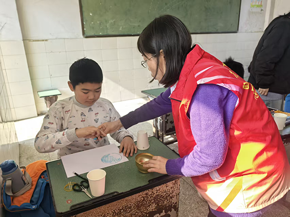 我拿出事先准备好的手工课开始讲起来:“同学们,今天我教大家做火箭模型!”台下掌声响起,小朋友睁着大大的眼睛看向我手里的火箭模型。“首先同学们拿出两个纸杯叠在一起,我们在纸杯的杯口2毫米左右的位置用铅笔画上一个小圆,接着将铅笔放在小圆180℃的位置再画一个小圆……”教室里面的同学们个个拿着笔跟着我的节奏往下走。只听见教室里铅笔的莎莎声,剪刀的剪纸声,橡皮筋绷紧的弹力声……声声清脆入耳。我边辅导着小朋友、边讲解着。