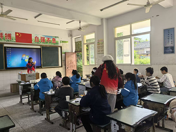 驱车两个多小时我们来到了东兴镇小学。学校目前一共六七名老师,现在学生生源更少,一年级已经停办,二到六年级,每个年级一个班,每个班级三四名学生。我们到时,有两名学生家里走了亲人请假回家了。冬日午后的阳光撒在操场上,照在小朋友泛红的脸上,在树影下显得单薄无力。校长和老师们出来迎接我们一行四人(其中两名文化馆的工作人员,一名司机)学校操场上放起了优美的欢迎曲。校长带领全校师生来到阶梯教室,等待着我的授课!