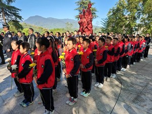 沐川县委书记余斌,县委副书记、县长赵星,县人大常委会主任胥大齐,县政协主席徐孝飞,县委常委、组织部长、关工委主任黄师,县关工委执行主任李正银等与学校师生和“五老”、青年志愿者代表一道,怀着无比崇敬的心情来到狮子山烈士陵园,在庄严肃穆的纪念碑前,向革命烈士三鞠躬。幸福小学40名师生齐唱中国少年先锋队队歌《我们是共产主义接班人》,以此寄托对革命先烈的缅怀之情,向革命烈士敬献花蓝,把鲜艳的黄白菊花敬献给英勇的烈士们。接着,引导师生们观看革命先烈们的英雄事迹,激发青少年对革命烈士的崇敬之情。