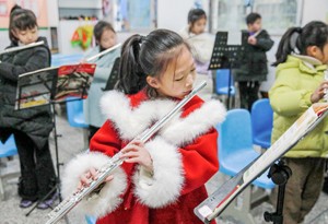 2024年2月22日,四川省华蓥市双河小学少儿管弦乐团的学生在吹奏长笛,上好开学第一课。