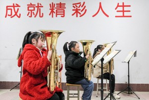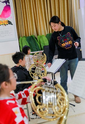 2024年2月22日,四川省华蓥市双河小学的老师在指导少儿管弦乐团的学生练习圆号,上好开学第一课。(邱海鹰 刘南贤 摄影报道)