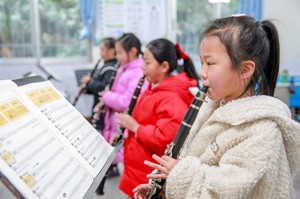 2024年2月22日,四川省华蓥市双河小学少儿管弦乐团的学生在吹奏单簧管,上好开学第一课。