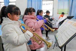 2024年2月22日,四川省华蓥市双河小学少儿管弦乐团的学生在吹奏小号,上好开学第一课。