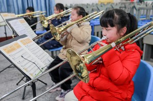 2024年2月22日,四川省华蓥市双河小学少儿管弦乐团的学生在吹奏长号,上好开学第一课。