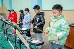 2024年2月22日,四川省华蓥市双河小学少儿管弦乐团的学生在练习哑鼓垫,上好开学第一课。
