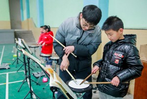 2024年2月22日,四川省华蓥市双河小学的老师在指导少儿管弦乐团的学生练习哑鼓垫,上好开学第一课。