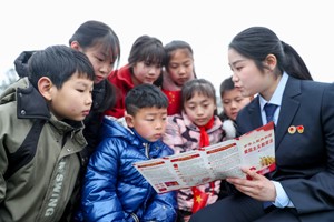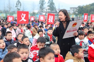 2024年2月26日,四川省华蓥市的普法志愿者在高兴海军希望小学,给刚开学的学生宣讲《爱国主义教育法》。