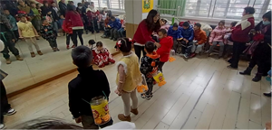 百发百中“套元宵”活动中,场地上整齐列队,从近到远,价值由低到高,摆放了学习、生活用品和孩子们喜爱的玩物礼品,他(她)们手挚塑料套圈,飞圈自如,把一个个礼品套入囊中。