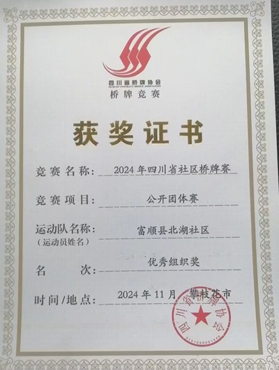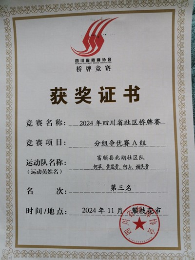 在11月8至10日的社区桥牌赛中,富顺县北湖社区和西湖社区代表队参加了比赛,选手们发挥稳定,经过6轮72副的排位赛,北湖社区队以总分第三的成绩进入第二阶段的分组赛A组的比赛。比赛越来越激烈,又是经过了6轮72副牌的较量,富顺北湖社区队获得2024年四川省社区桥牌赛A组季军的历史最好成绩,北湖和西湖社区代表队均获优秀组织奖。(陈学萍)
