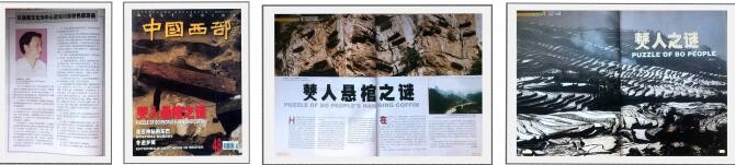 图(1)→珙县县委书记范崇宁在《中国西部》谈“以悬棺文化为中心建设川南特色旅游县”;图(2)→《中国西部》(2001年12月号总第48期)封面;图(3)→《中国西部》第16~17页,登载“僰人悬棺之谜”(江小阳/文 牛牛/图);图(4)→《中国西部》第18~19页,登载“僰人之谜”(杨树帆<西南民族大学副教授>/文 牛牛/图)。