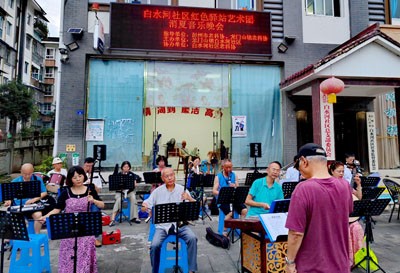 晚会汇聚了社区老科协会员、旅居游客中的文艺爱好者以及龙门山镇白水河社区“红色驿站艺术团”的成员,共计16名业余演员登台献艺。他们带来了丰富多彩的13个节目,包括: 器乐合奏《边疆处处赛江南》女声独唱《江山》(演唱:刘晓华)男声独唱《咱老百姓》女声独唱《我们的生活充满阳光》男声独唱《伊犁河的月夜》男女二重唱《春风十万里》女声独唱《长江之歌》