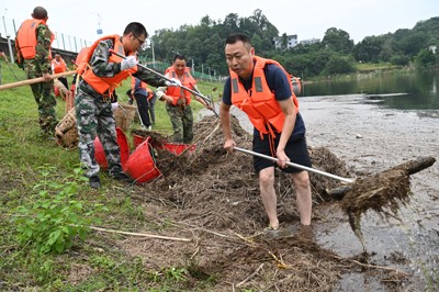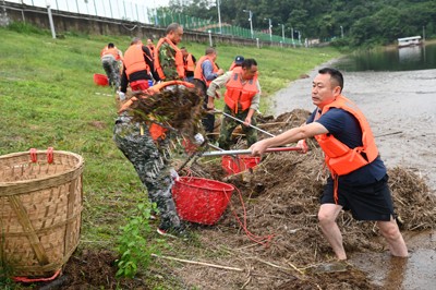 现场看到,20多名打捞组队员,有的用耙子一耙一耙的将漂浮物搂上岸,有的干脆脱去长裤身穿救生衣下水直接用背篓装;10多名转运组队员,有的扛起扁担用箩筐挑,有的则用背筐背,藏在漂浮物中的水跟着裤子流。“他们的衣服裤子,肯定全部都打湿了。”大坝上围观的群众这样说。