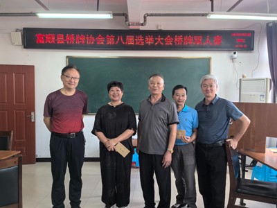 10月15日,富顺县桥牌协会召开换届选举大会暨桥牌双人赛。会员们以认真负责的态度选举产生了新一届富顺桥牌协会的领导班子成员,黄显贵当选为新一届富顺桥牌协会主席。大家表示将以更加饱满的激情推动富顺桥牌运动的提升和发展。自贡市桥牌协会副主席兼秘书长牟位学,富顺县老体协会长周正聪及全体协会会员参加会议。