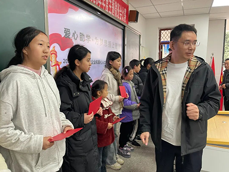 在热烈的掌声中,爱心助学仪式正式开启。川渝爱心团队的爱心人士将31000元转交到受助学子手中,这份助学不仅是对学生物质上的帮助,更是对他们精神上的鼓励和支持。受助学子代表登台发言,稚嫩的声音里满是感恩,承诺将把这份关爱化为学习的动力,勤奋求学、不负厚望。乡党委书记、关工委主任袁鑫野也为学子们送上寄语,鼓励大家心怀感恩、立志成才,将来用实际行动回馈社会。