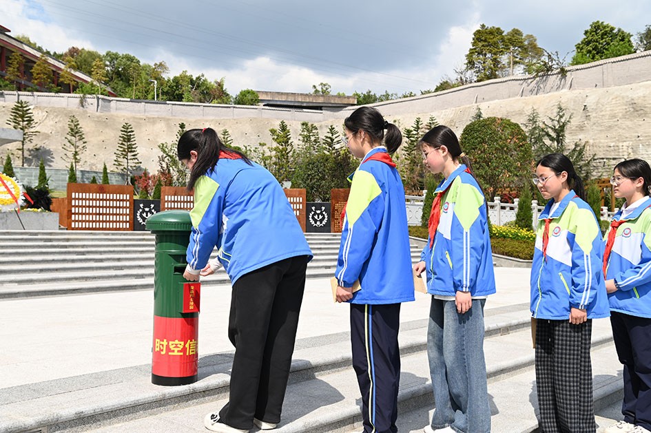 陵园祭英烈,在肃穆中对话忠魂。荣县烈士陵园松柏苍翠、丰碑巍峨,队伍抵达目的地后,欢声笑语瞬间转为肃穆安静。奏唱国歌、向烈士默哀、行鞠躬礼、退役军人礼兵向烈士敬献花篮、退役军人事务局与荣新小学党组织负责人整理花篮缎带……每一个环节都凝重而有序。最为动人的环节当属“时空信箱”。10名学生将提前写好的《致烈士的一封信》,郑重地投入信箱,仿佛完成了一次跨越时空的对话。学生吴婉绮稚嫩的笔迹在信纸上舒展:“亲爱的烈士爷爷,谢谢你们用生命守护了这片土地,我会把这份敬意与感恩藏在心里,好好长大,把你们的故事讲给更多人听……”随后,参加祭扫的全体人员手持鲜花走向墓区,轻放在墓碑前,并深深鞠躬,向长眠于此的英雄致以崇高敬意。