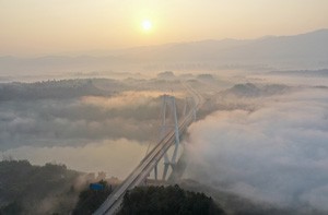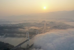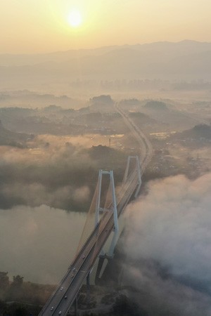 图为2023年2月26日,晨雾缭绕中的四川省广安市连接广安和华蓥城区的广华快速通道清溪口渠江特大桥,在晨曦的映照下显得格外美丽壮观。(邱海鹰)
