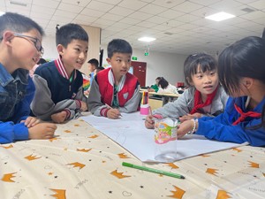 分组设计完成后,各小组派出两名代表对设计图进行汇报讲解,讲解完毕后,大家讨论方案的可行性。儿童们积极思考发言,发挥想象力。通过讨论,大家一致同意综合三个小组的设计元素,在绿地设置具有儿童元素的座椅、放置垃圾桶、书写悬挂吊牌,营造儿童友好氛围,同时加入古诗词、儿童美术作品等元素,在这个空间游玩的同时也能学习到知识。