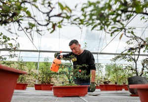 2023年11月2日,四川省华蓥市华龙街道柏木山村榴鑫园艺公司的工人,在为拟在“双11”销售的盆景施喷杀虫剂。