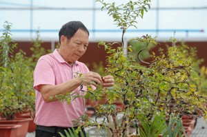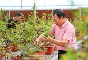 2023年11月2日,四川省华蓥市华龙街道柏木山村榴鑫园艺公司的工人,在为拟在“双11”销售的盆景修枝。(邱海鹰)