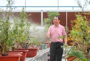 2023年11月2日,四川省华蓥市华龙街道柏木山村榴鑫园艺公司的工人,在为拟在“双11”销售的盆景浇水。