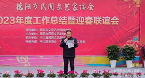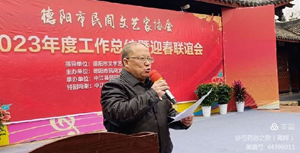 首先市民间文艺家协会副主席、中江县民协主席廖昌友致欢迎词。他代表中江县民间文艺家协会,向莅临中江出席此次联谊活动的市、县、区民间文艺家协会领导和中江县文联下属各协会领导、社会团体负责人表示热列的欢迎!并祝德阳市民间文艺家协会2023年度总结暨迎春联谊会园满成功!