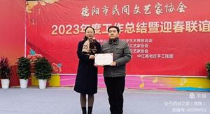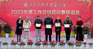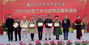 德阳市民间文艺家协会功能性党支部书记缪培生,对2023年党建工作总结;安排了2024年党建工作;宣读了德阳市民间文艺家协会表彰2023年度“优秀会员”的决定和德阳市首届民间艺术作品展获得一、二、三等奖名单。 出席活动的市民协领导们分别为受表彰的2023年度“优秀会员”和为德阳市首届民间艺术作品展奖获得者颁发了荣誉证。