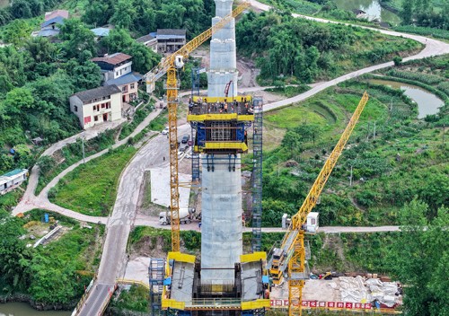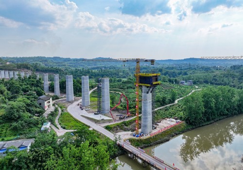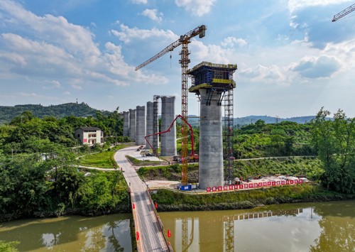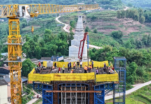 2024年5月16日,在西渝高铁(康渝段)站前工程十一标段四川省广安华蓥市庆华镇天龙山1号华蓥河特大桥施工现场,中铁十局的工人在32号桥墩上浇筑首联连续梁0号块,标志着该座特大桥正式进入梁体施工阶段,拉开了管段内桥梁上部结构施工序幕。